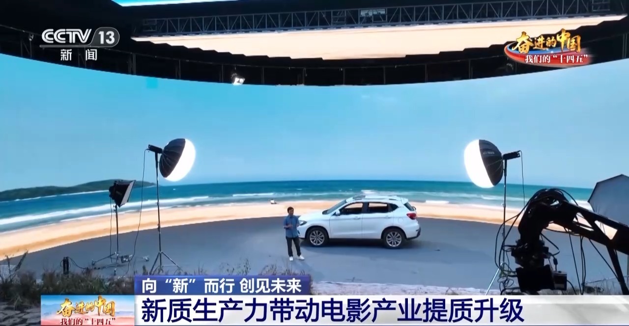 记者站在科技演播室的虚拟拍摄室内。他身后的LED背景屏快速移动变化,实时渲染输出高清图像。从一个场景切换到另一个场景只用了不到1秒的时间。